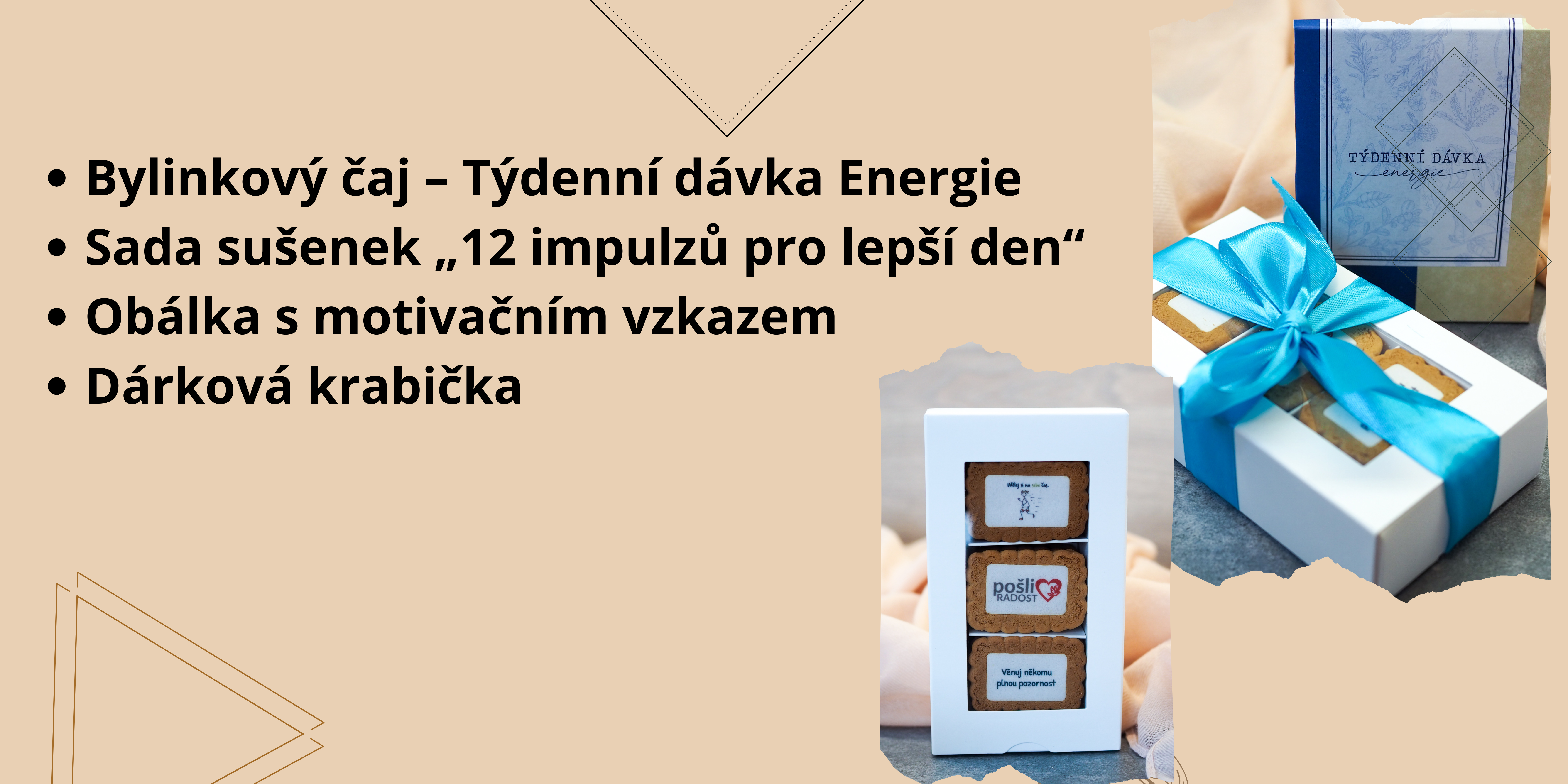 Dárek, který nejen chutná, ale i motivuje. Elegantním balení obsahuje bylinný čaj s inspiračními myšlenkami na každý den a dvanáct originálních perníčků s drobnými úkoly – „12 impulzů pro lepší den“. Každý perníček přináší jinou výzvu: k úsměvu, vděčnosti nebo odvaze.