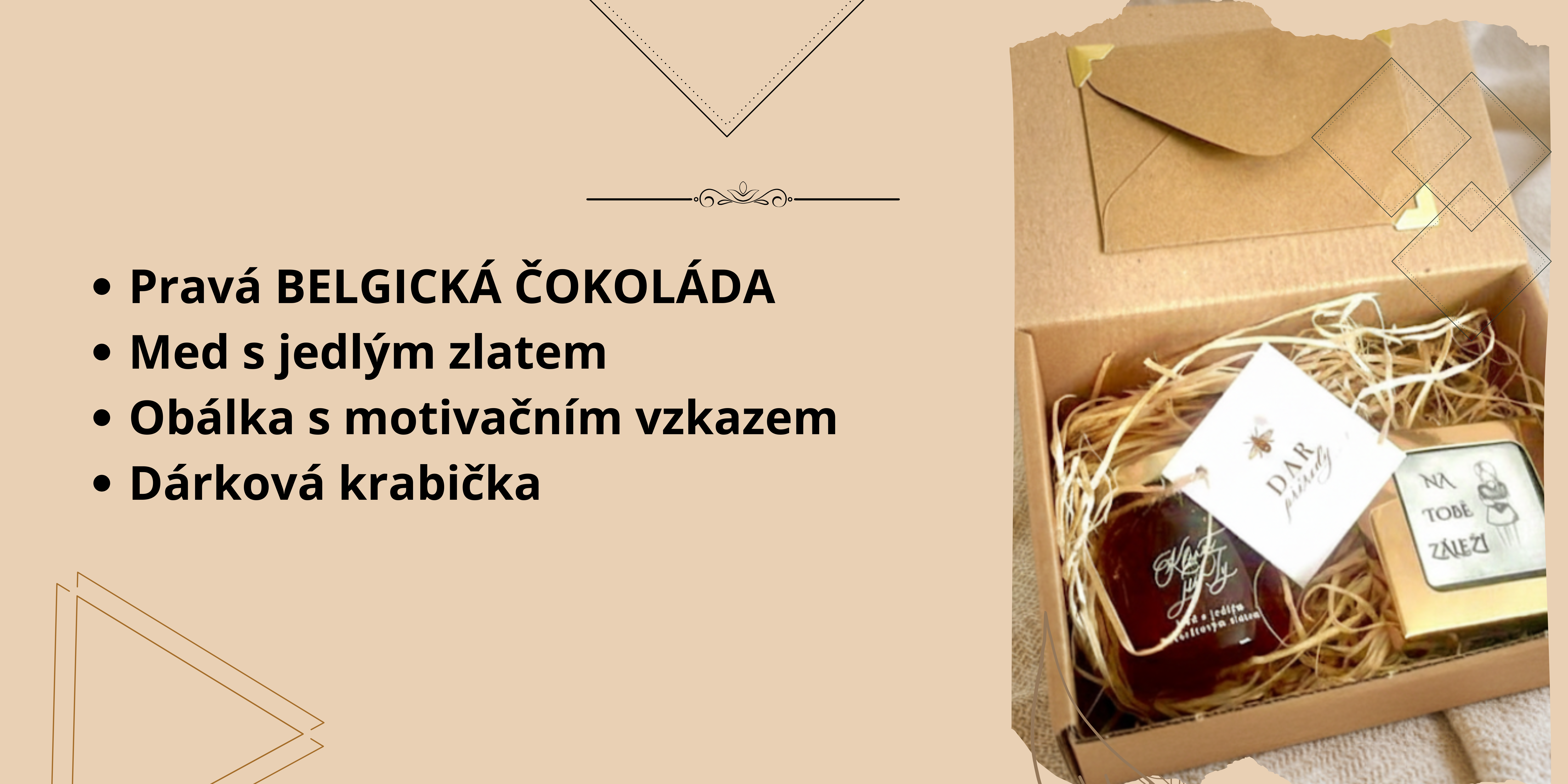 Někdy stačí drobnost, která rozzáří den – třeba med (65 ml) s vločkami jedlého zlata a kousek belgické čokolády s jemným nápisem „NA TOBĚ ZÁLEŽÍ“. Uvnitř se snoubí chuť, krása i myšlenka. Med pochází z adoptovaného úlu – tedy od včel, které po celý rok pečují o krajinu kolem nás. Každá sklenička tak nese příběh o péči, spolupráci a smyslu.
