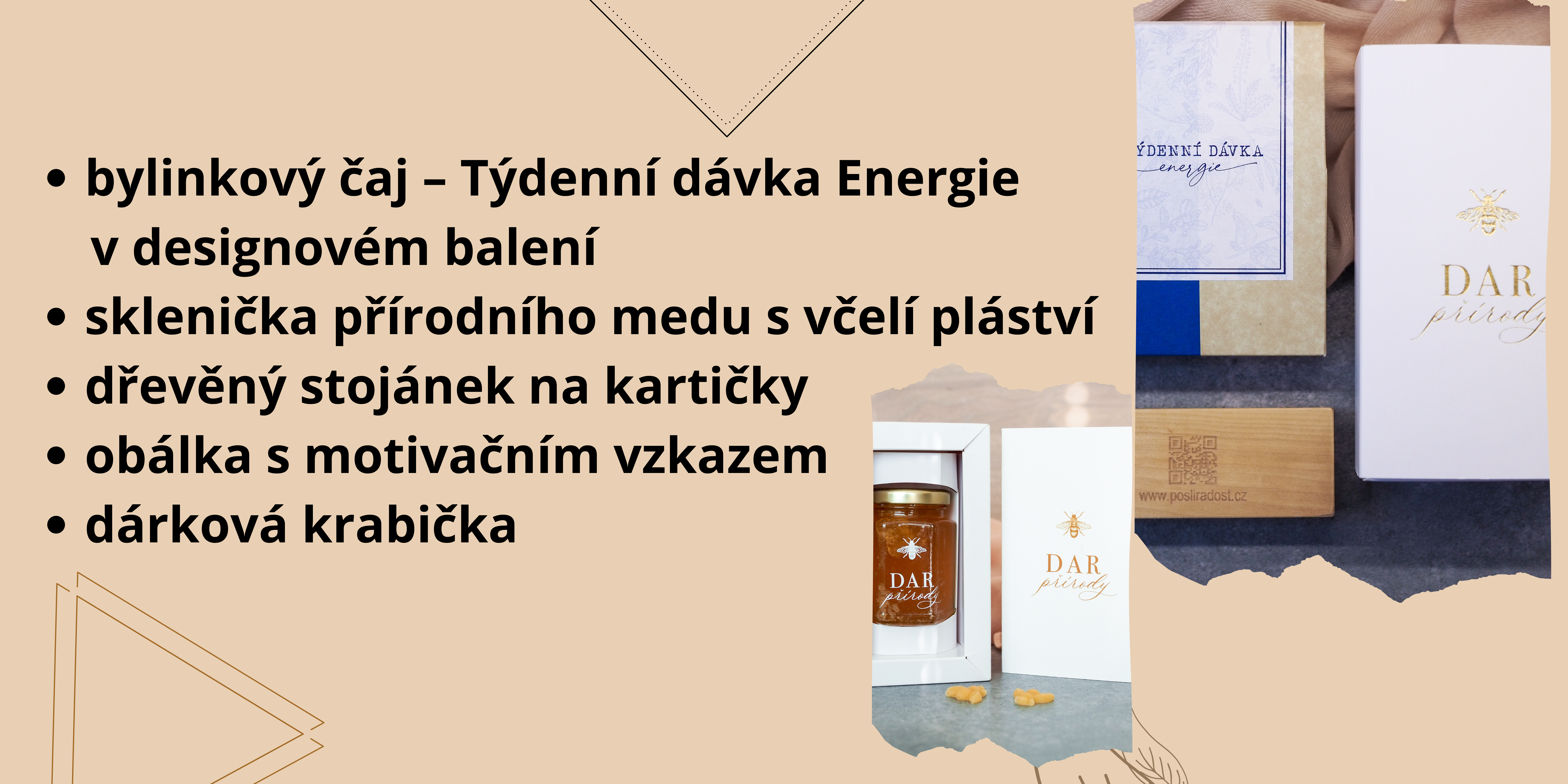 Symbol péče a klidu. V krabičce se ukrývá pět originálních čajů z kolekce Sluneční pozdrav, pět krátkých motivačních myšlenek a sklenička českého medu. Každý den jiná chuť, jiný vzkaz, jiné zamyšlení – drobný rituál, který obdarovanému připomene, že na něj myslíte.