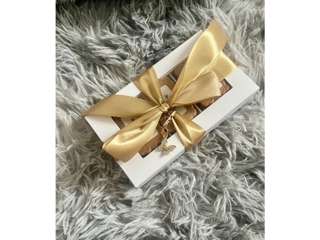 Dárkovou krabičku se zlatou mašlí a přívěsek motýla (symbol proměny a nových začátků)
